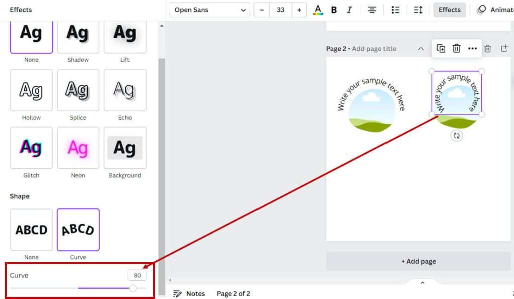 To wrap text around an image in Canva, first add the circle object or shape to your Canva design. Now enter your text, and click on Effects. On the bottom left of the screen, choose ‘Curve’. Adjust the values of the curve to wrap your text in the shape you want.